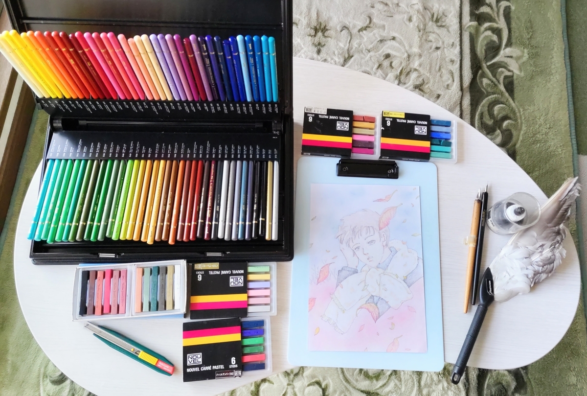 「イラスト」と画材。72色鉛筆。年賀状を書かなくなって、久しぶりのお目見え。クレパスはカッターナイフで削ってティッシュで引き延ばす。背景が広範囲の時に簡単。これも久々。インクはドクターマーチンの黒を希釈して使った。これ、大学時代に買ったやつ。使えたわ~♪久しぶりって30年近く前だけどね。
